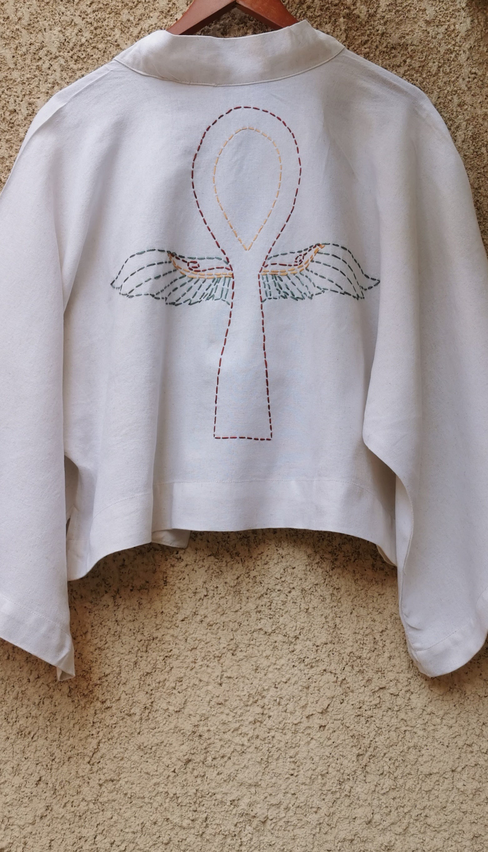 The Khepri Pure Linen Embroidered Top & Pant set features hand embroidery inspired by ancient Egyptian motifs. Crafted from pure Egyptian linen, the harem-style pants showcase an Egyptian Lotus design, while the top displays a scarab embroidery on the back. This combination of artistry and quality fabric ensures breathability and comfort.